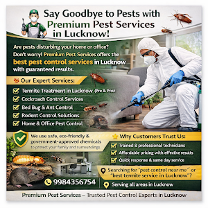 At Premium Pest Control Services Private Limited, we offer top-rated pest control service in Lucknow for homes, offices, and commercial spaces. Our expert team provides effective and eco-friendly solutions for all types of pest problems, including termite control in Lucknow, rat control in Lucknow, cockroach control, bedbug treatment, and ant control service in Lucknow. We proudly serve all major areas such as Gomti Nagar, Indira Nagar, Aliganj, Rajajipuram, Jankipuram, Ashiyana, Alambagh, and Hazratganj. With years of experience and advanced pest management techniques, we ensure 100% satisfaction and long-lasting protection. Looking for the best pest control near me in Lucknow? Call Now for Affordable Pest control services in Lucknow.